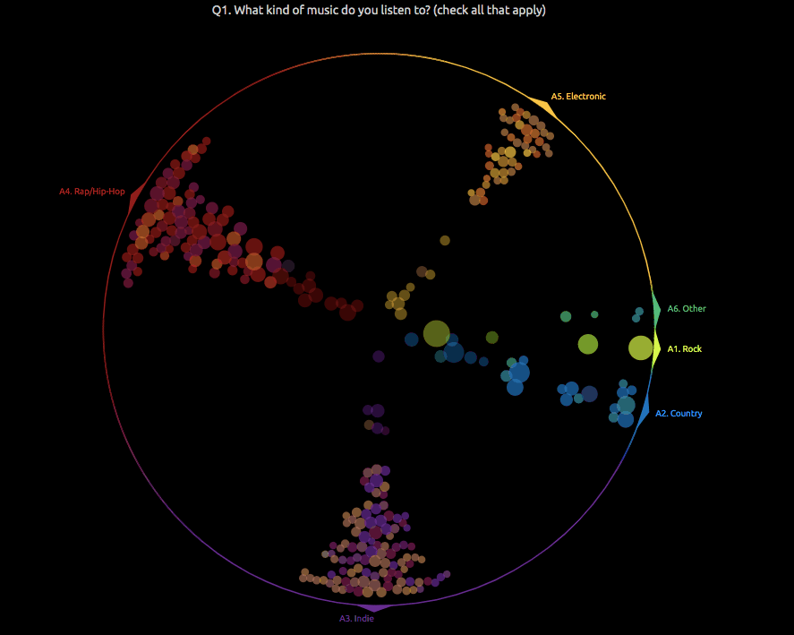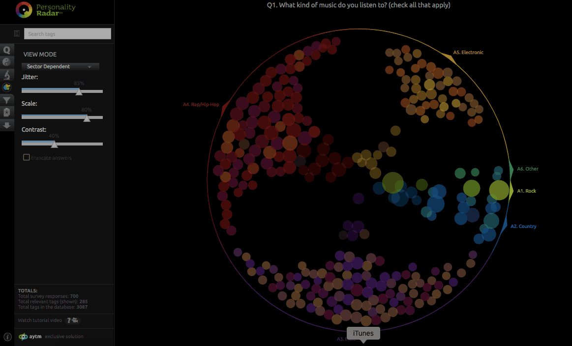 Your Personality Radar includes a custom pie chart for each question in your survey. You will notice the full question at the top of the screen as well as each answer choice surrounding the outer rim of the circle. Each answer choice includes a number of bubbles in each "slice" of the chart. These bubbles represent specific consumer traits that are represented within each respondent. You can hover each of these bubbles to see which trait it represents. The larger the bubble, the more respondents identify with that particular trait. The bubbles located more towards the center of the circle are more universally represented throughout each answer choice. |